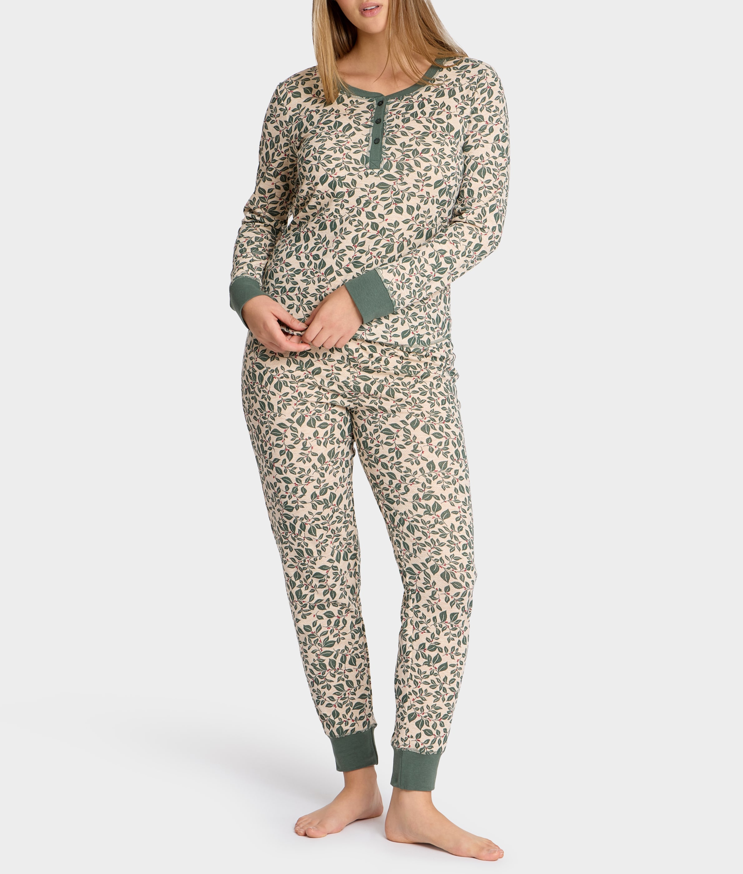 - Cuddle up in this thermal knit striped pajama set