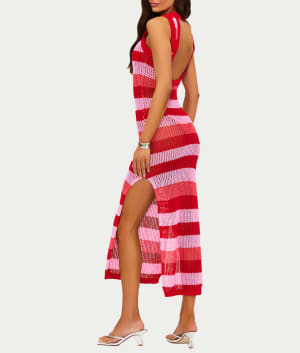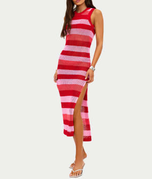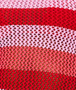 - Striped crochet-knit fabric in ruby, blush, and pink hues