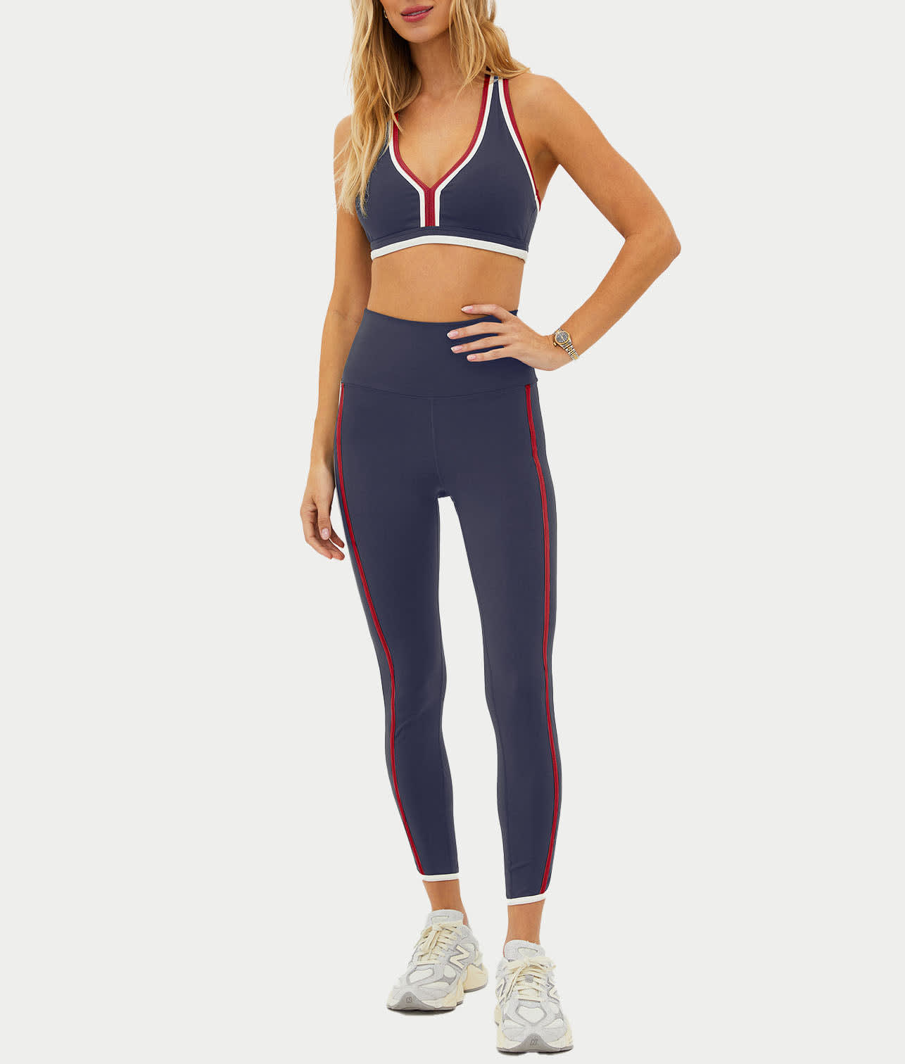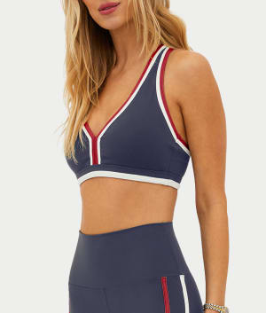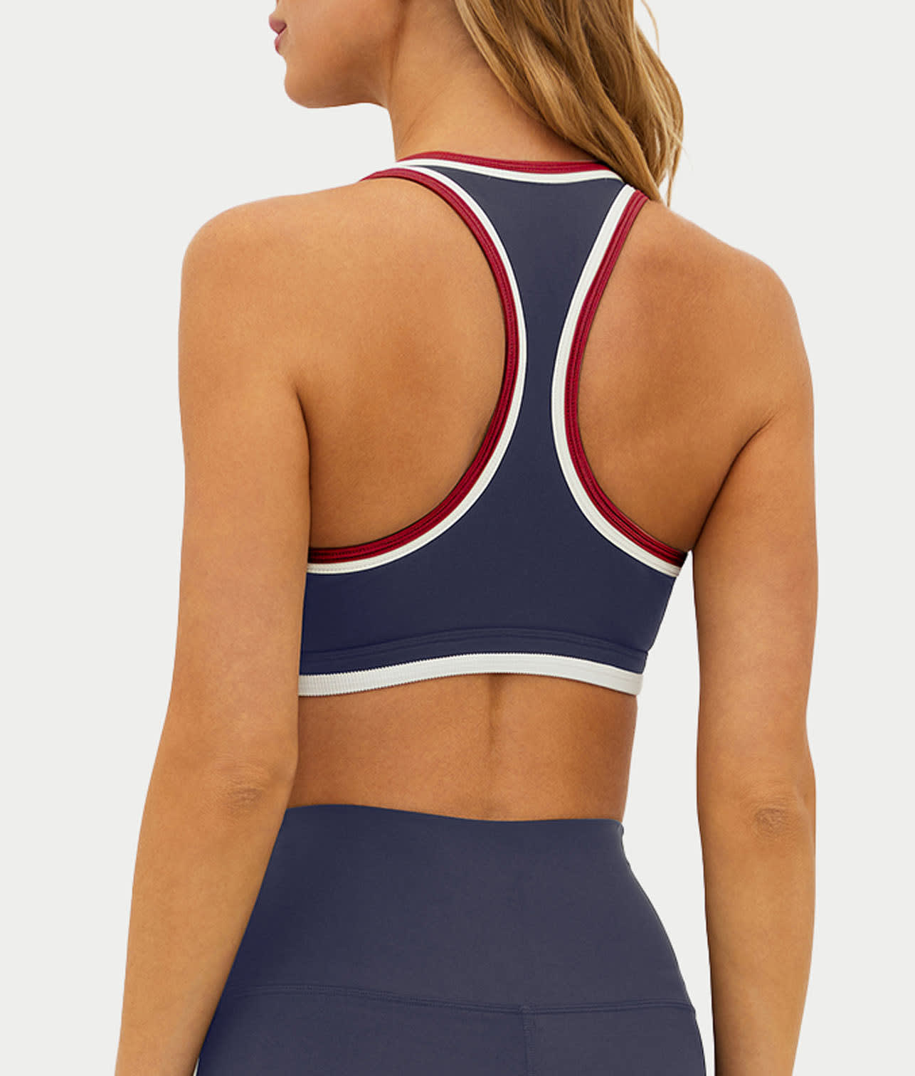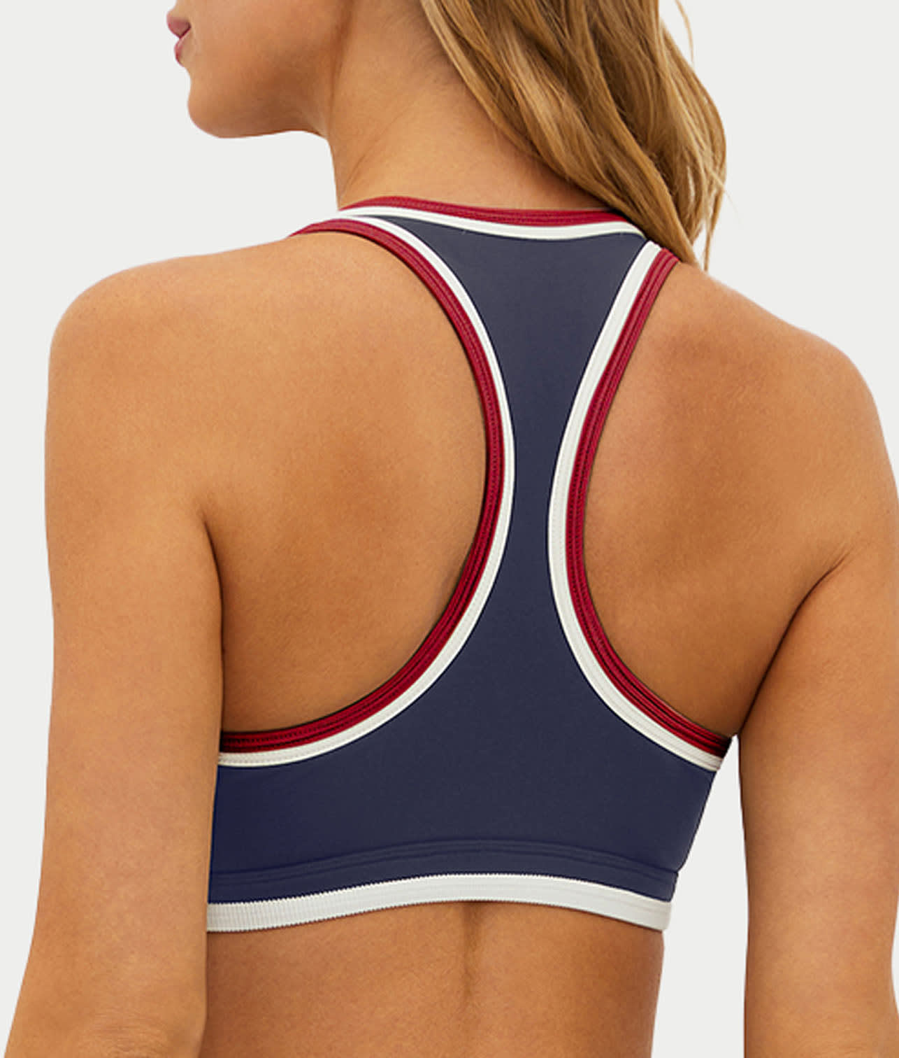 - Feel fashionable and sporty in this red, white and blue sports bra