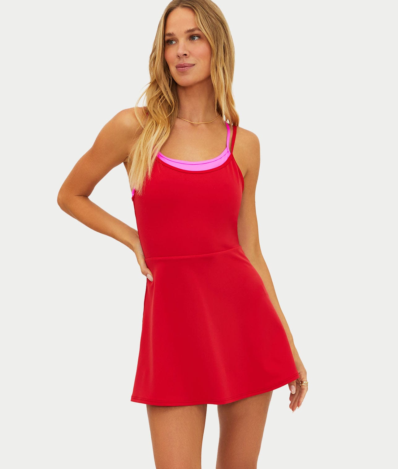 • Scoop neckline with vibrant red and contrasting pink trim