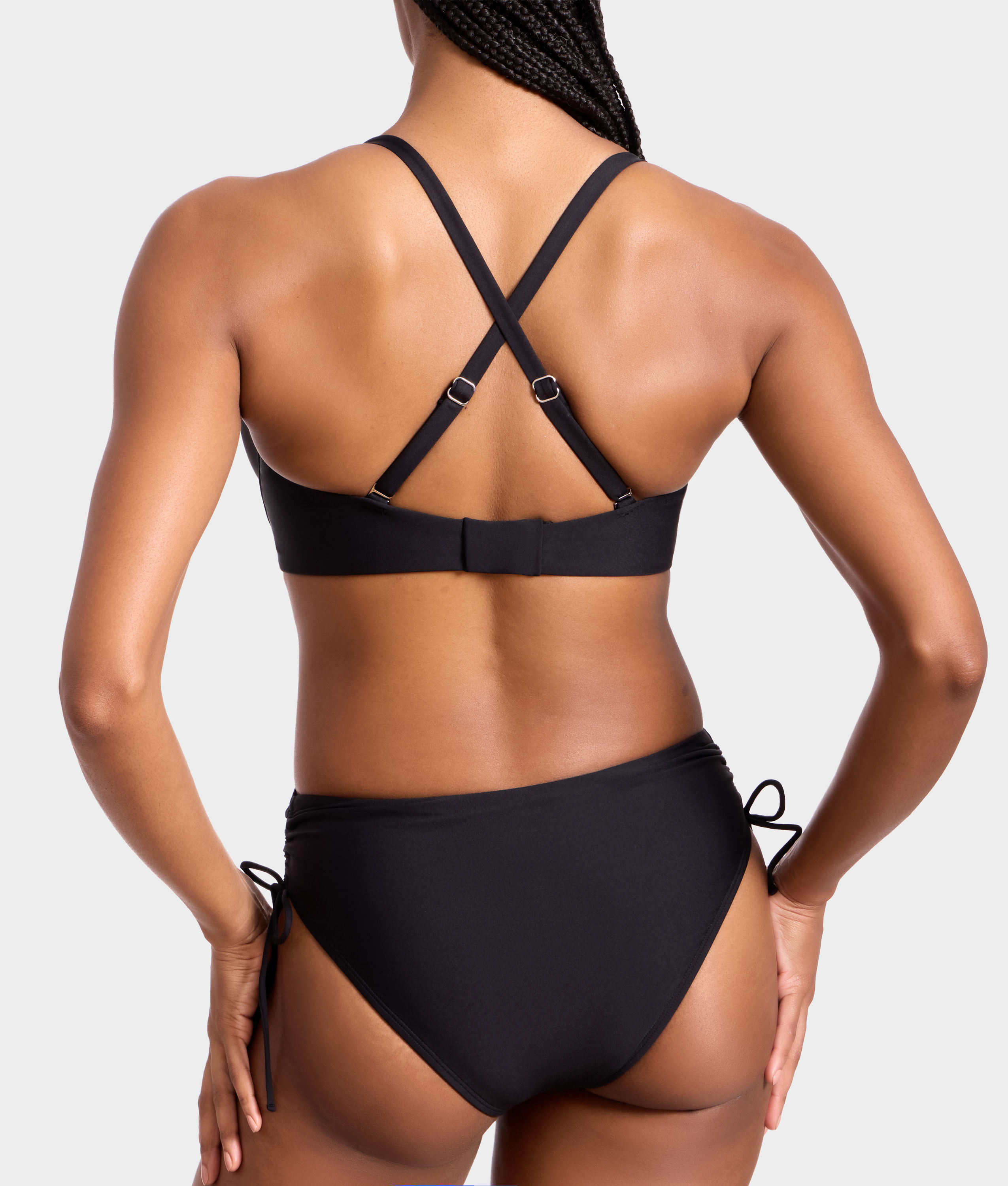 - Higher cut on the sides with adjustable ties