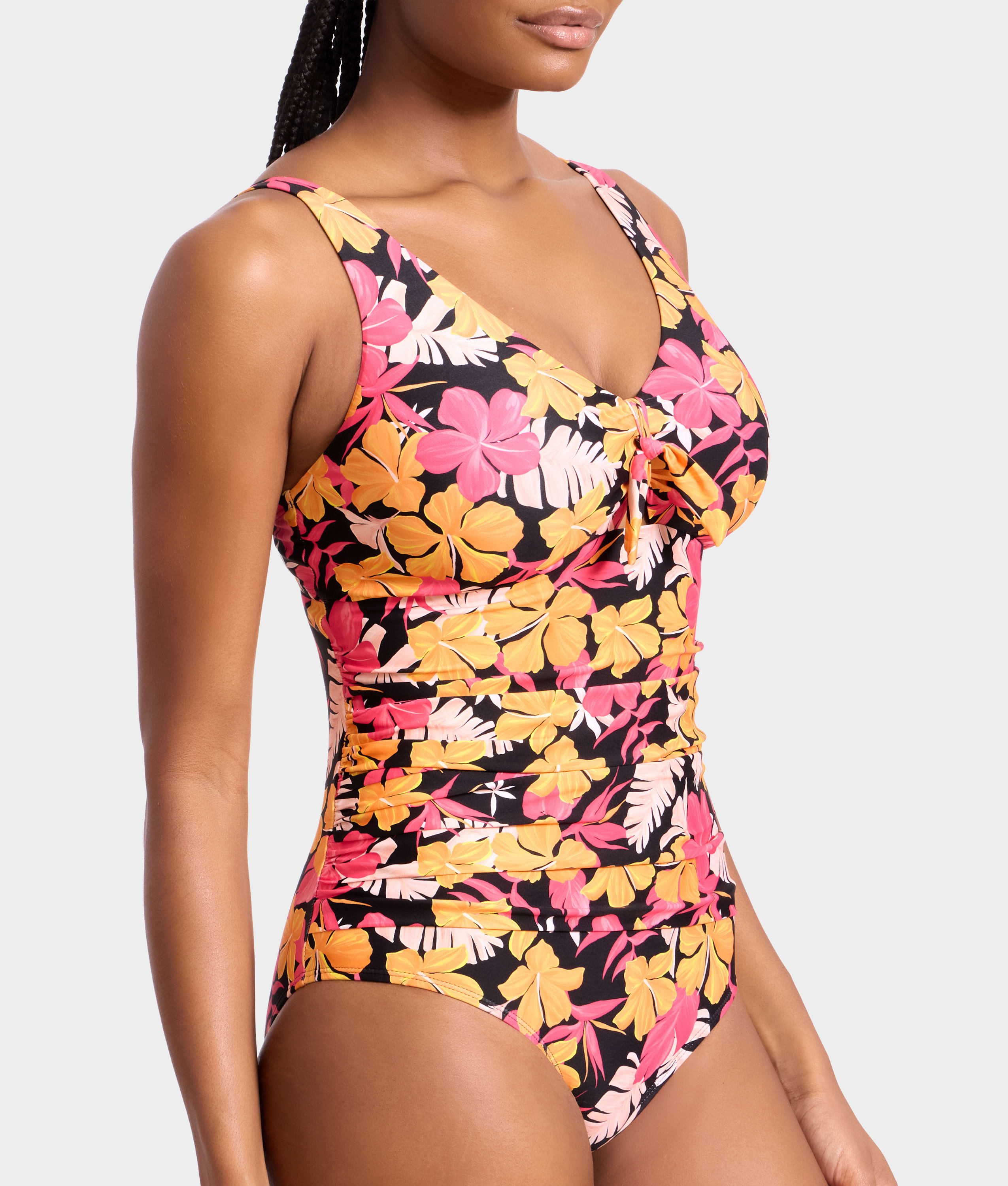 • Ruching along sides for a figure flattering look