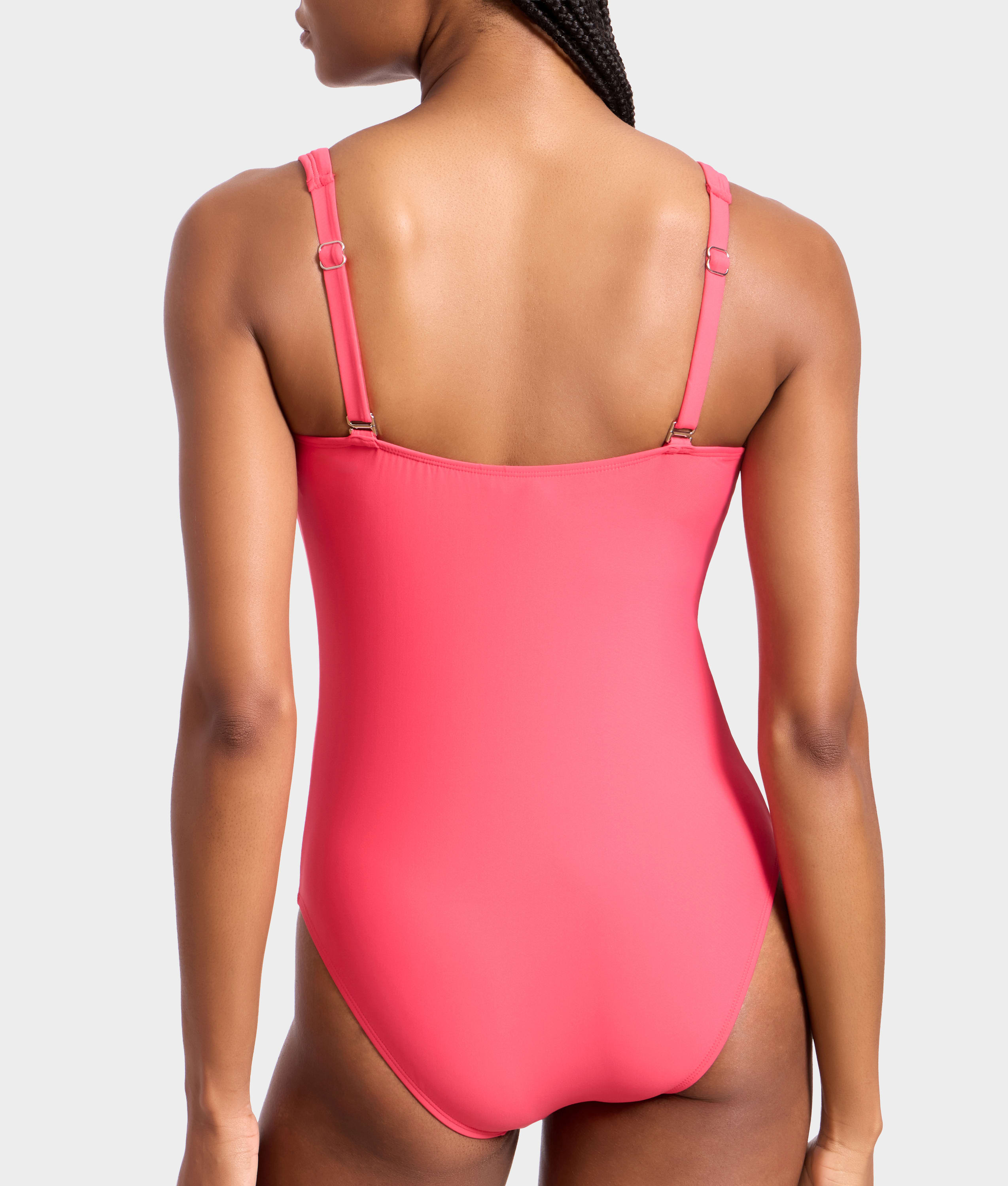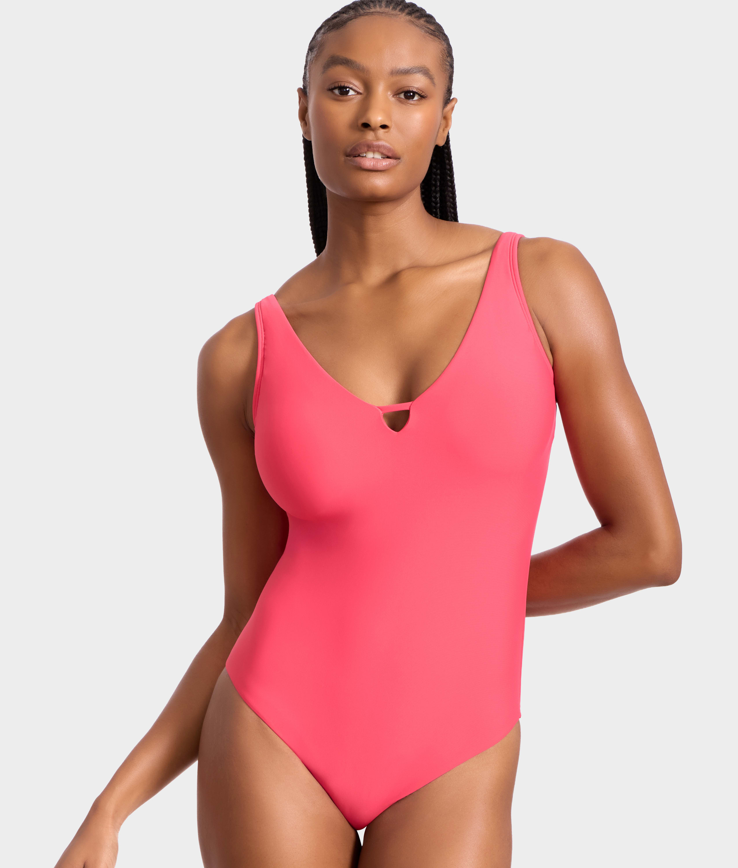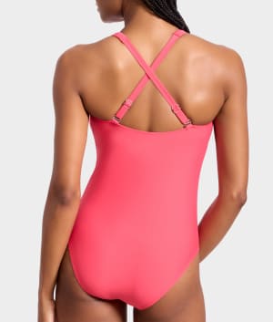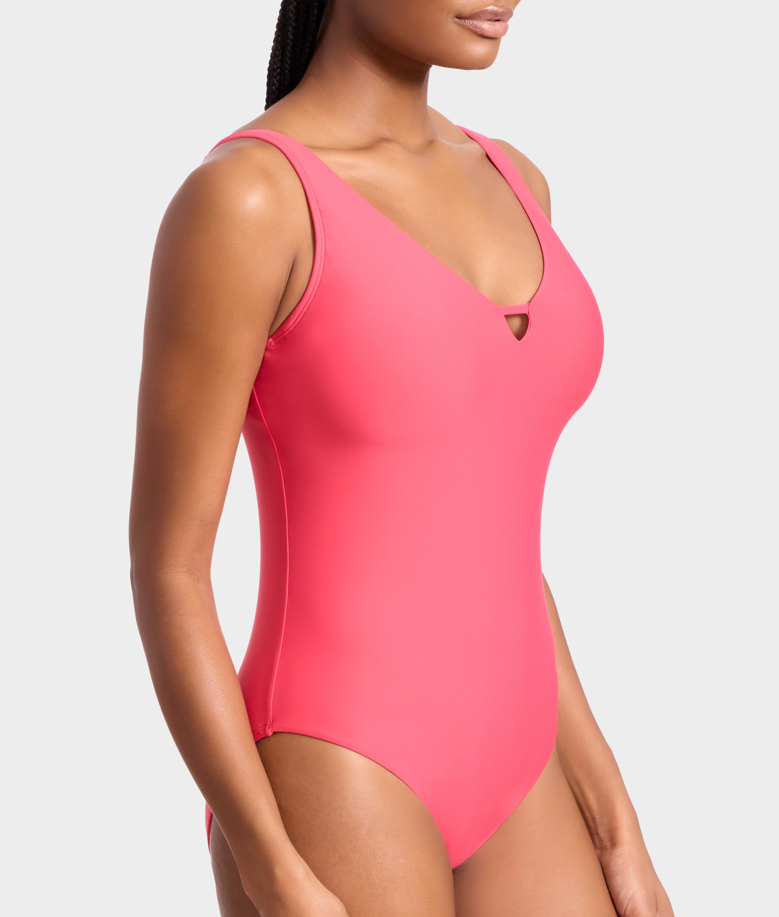 - Feel chic at the shore in the sleek plunging one-piece