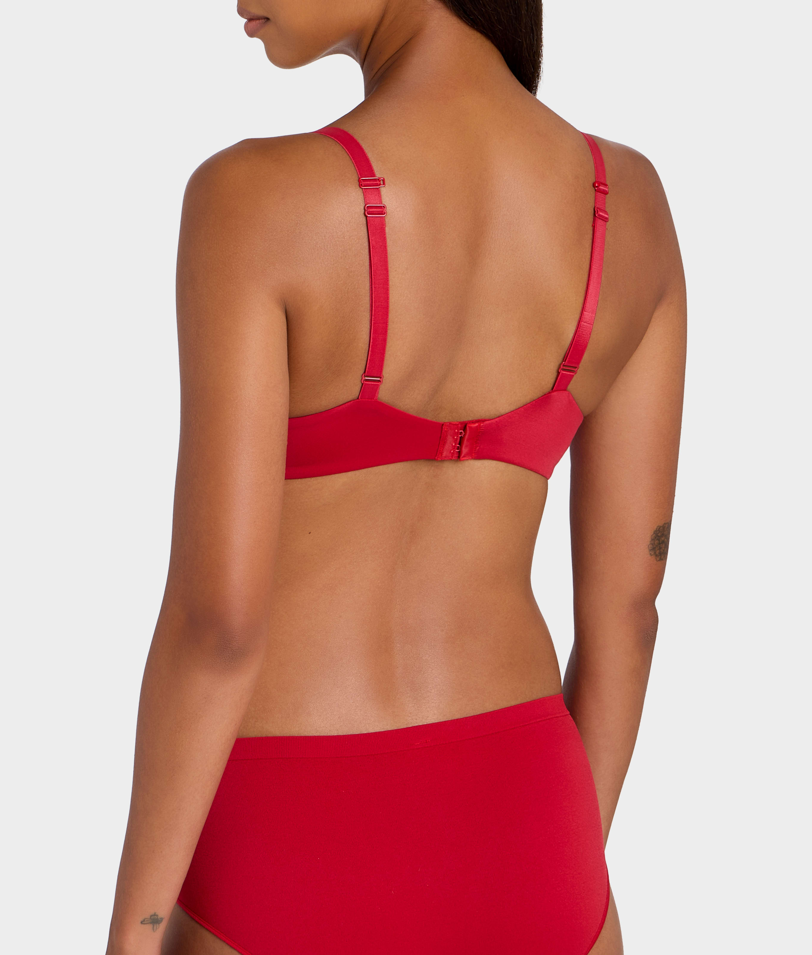 - Foam-lined, wire-free plunge cups with a subtle sheen