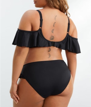 - Playful ruffle can be worn on or off the shoulders