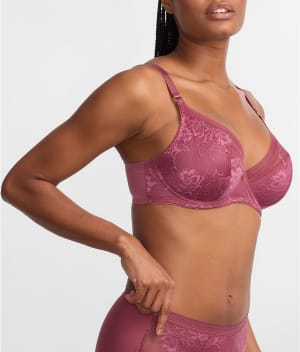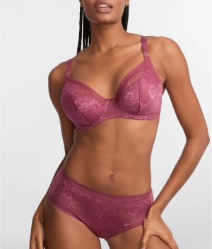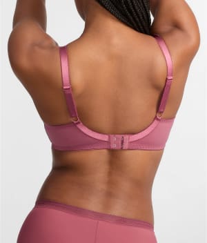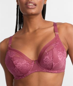 - Flat lace adorns cups with elasticated neckline for a custom fit