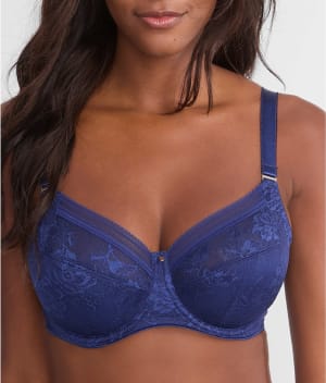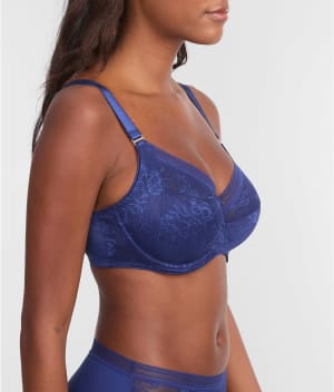 - Flat lace adorns cups with elasticated neckline for a custom fit