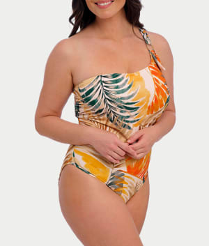 • Turn heads on the sand in this tropical print one-piece