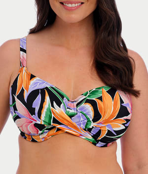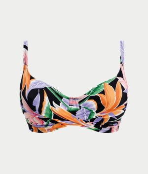 - Full cup swim top with botanicals in pops of green, pink, lilac & orange