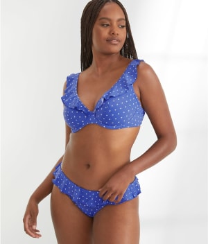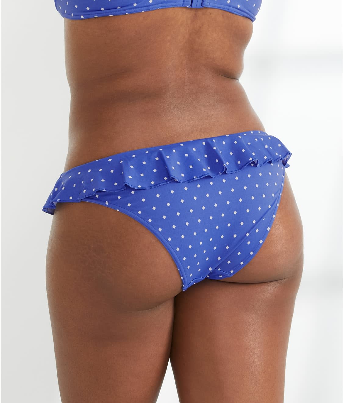 - Flirty, ruffle trim cheeky Brazilian bikini bottom