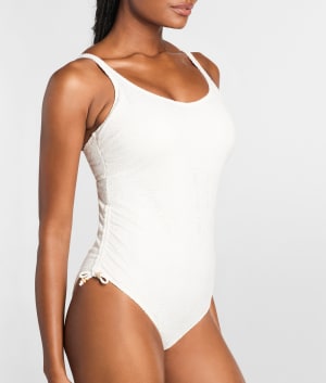 • Hit the beach in this scoop neck textured one-piece