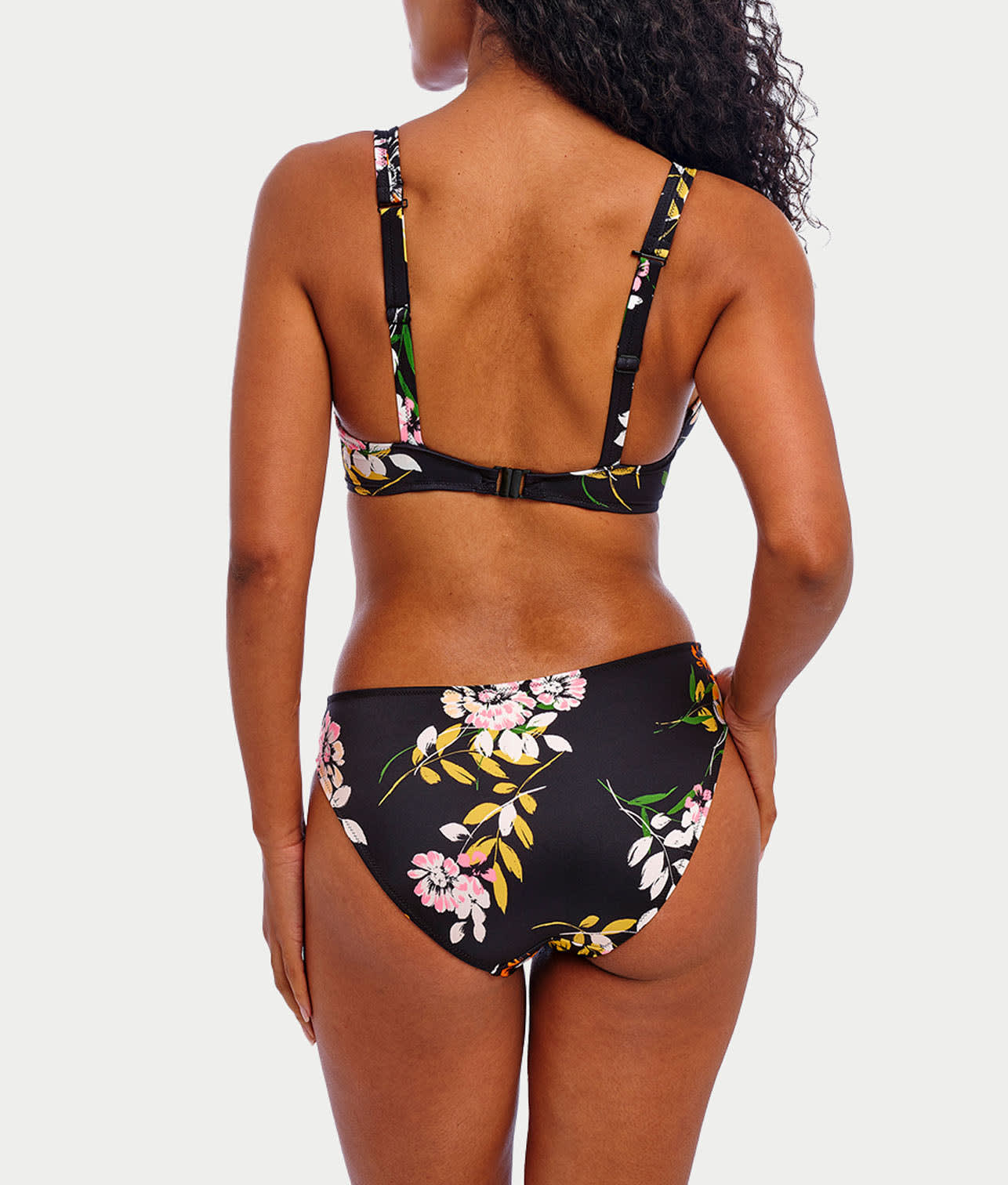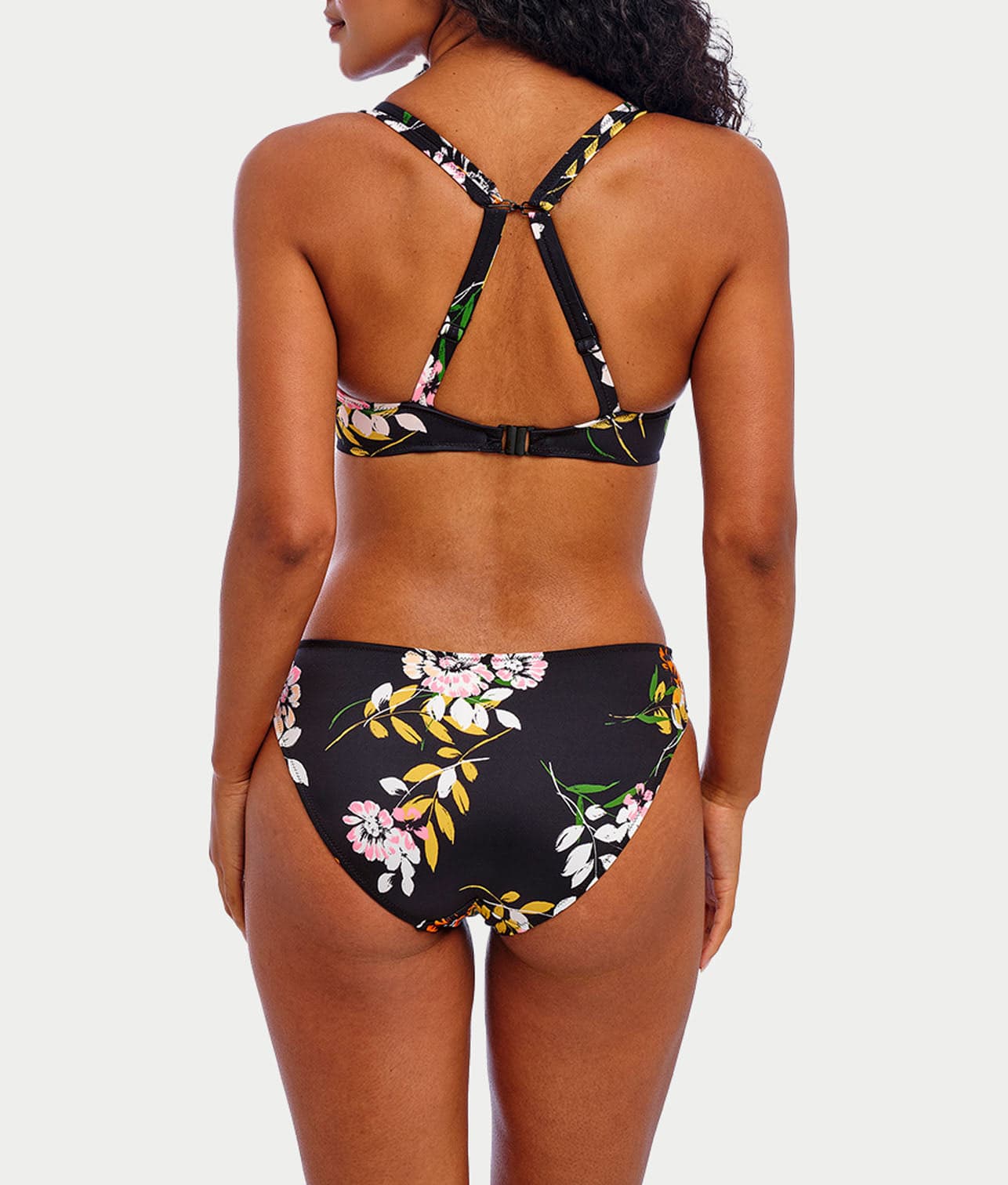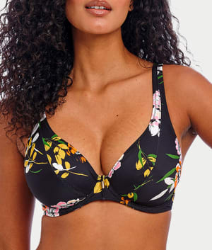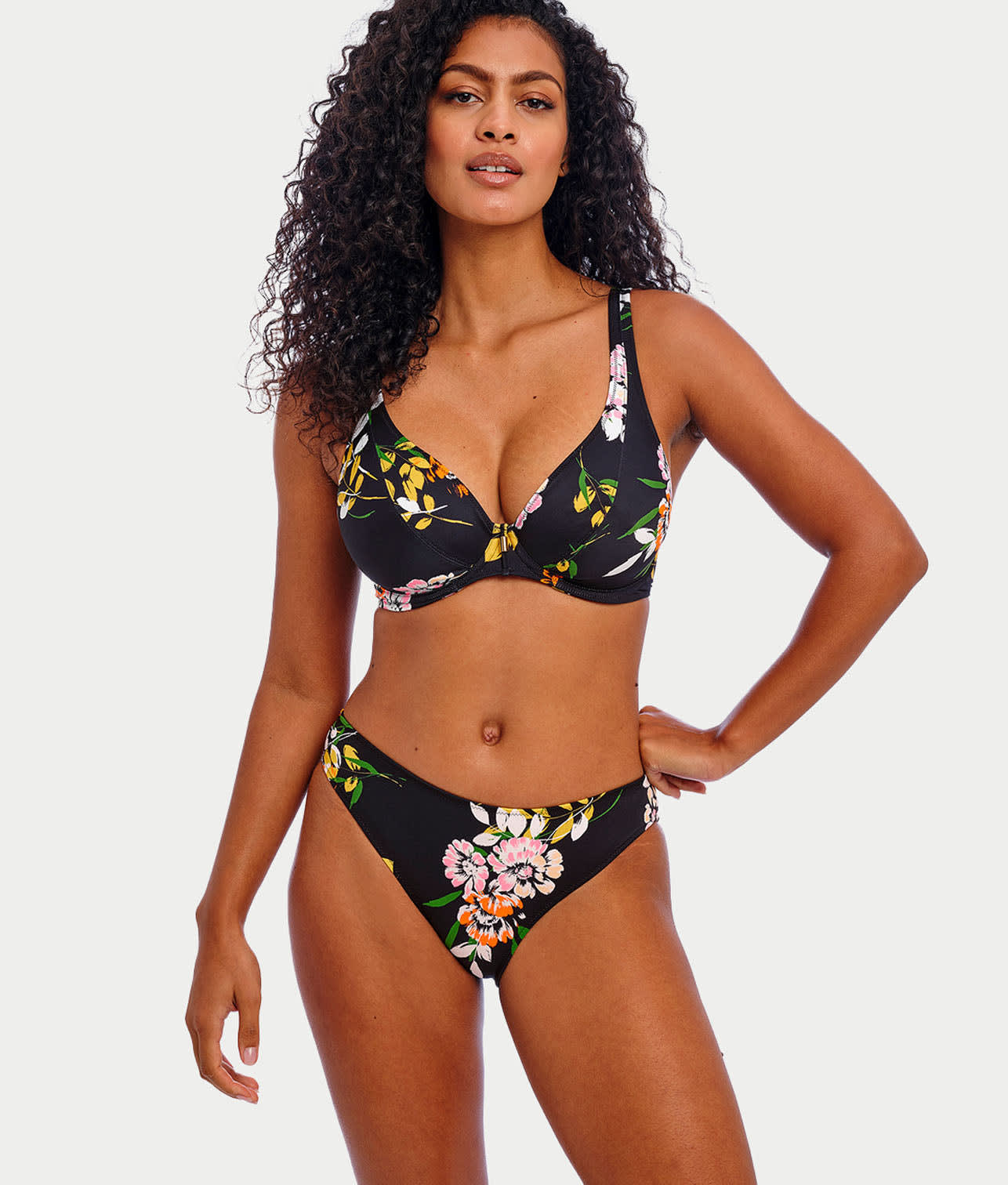 - Low plunging neckline floral bikini with an elongated apex