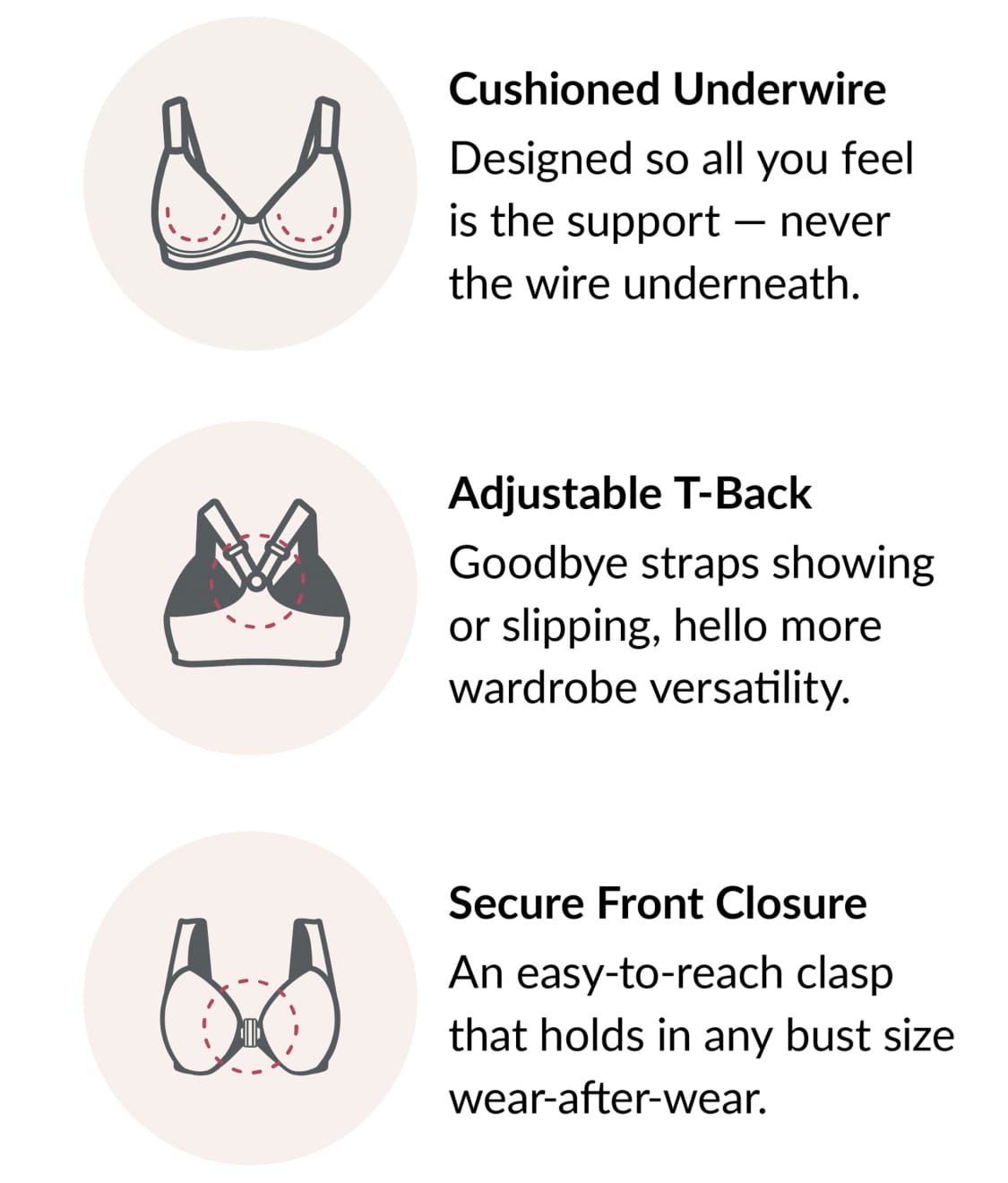 • Seamed, 3-part unlined cups have inner slings for shape