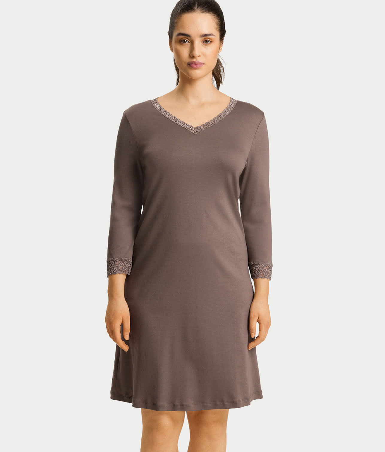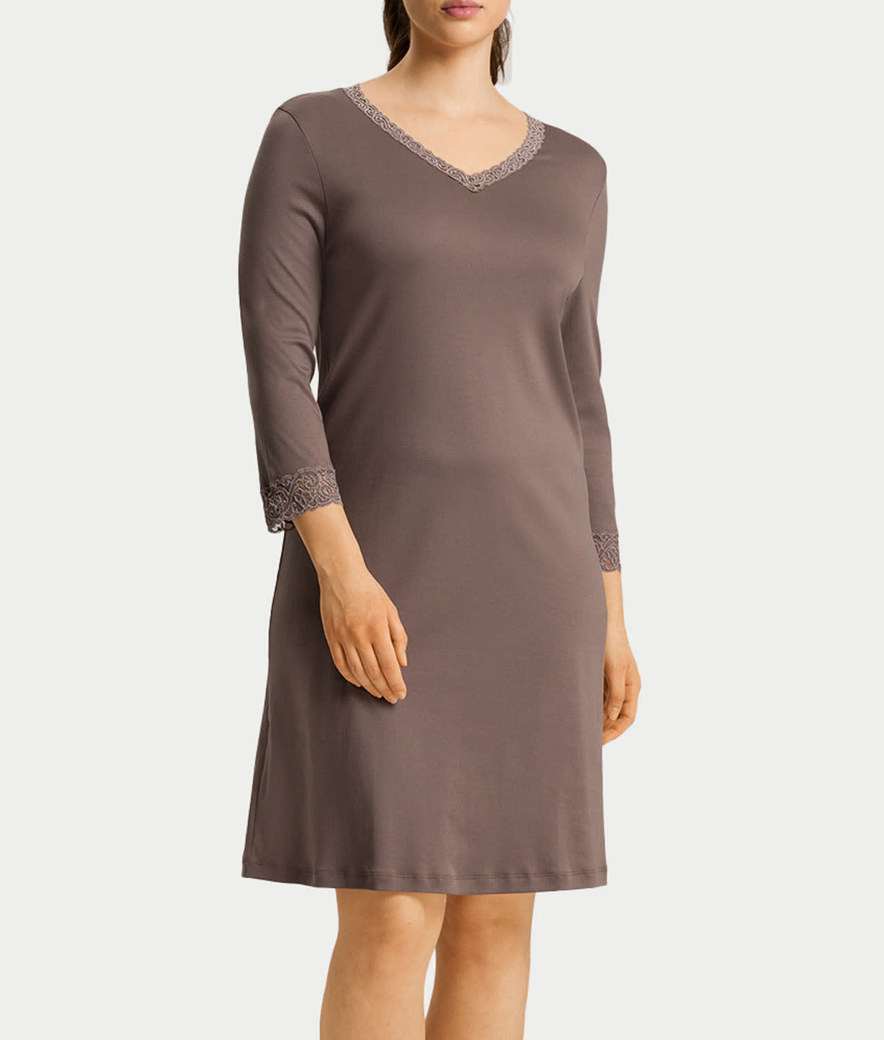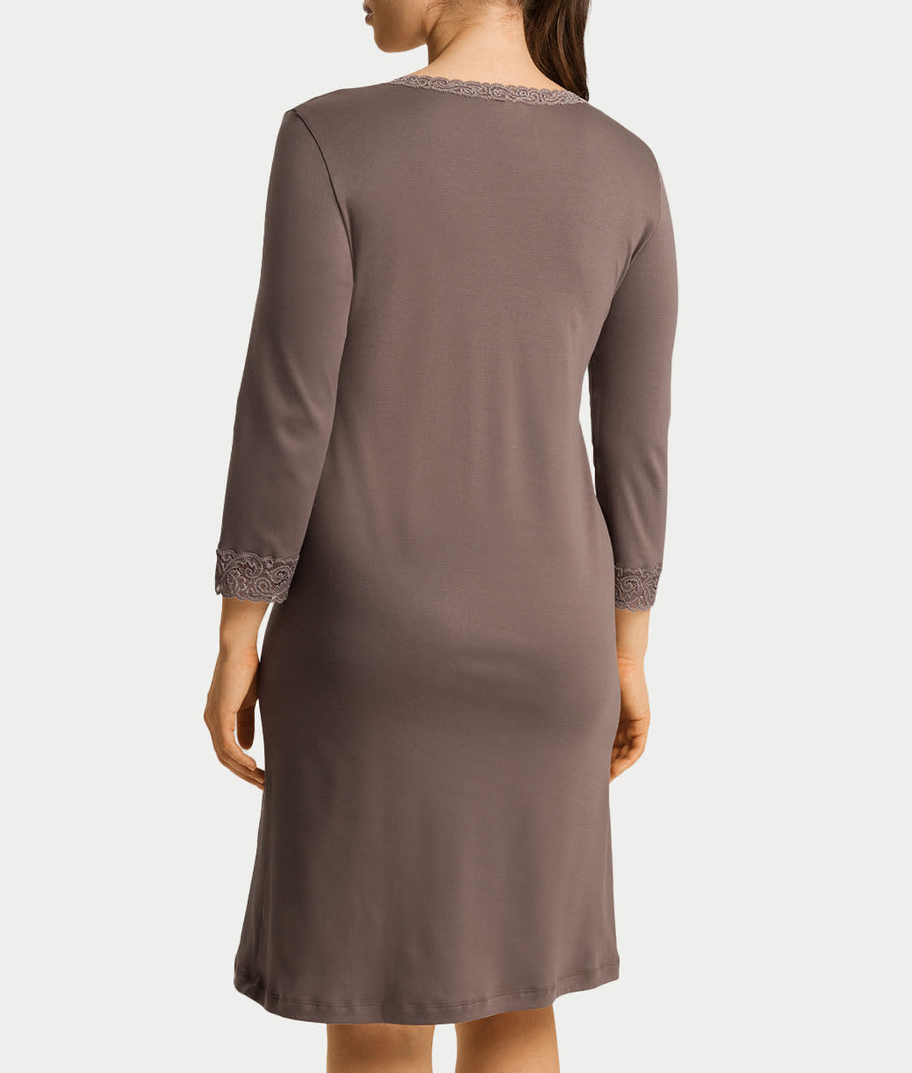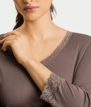 - Decadent lace on neckline and sleeves adds a feminine touch