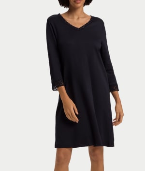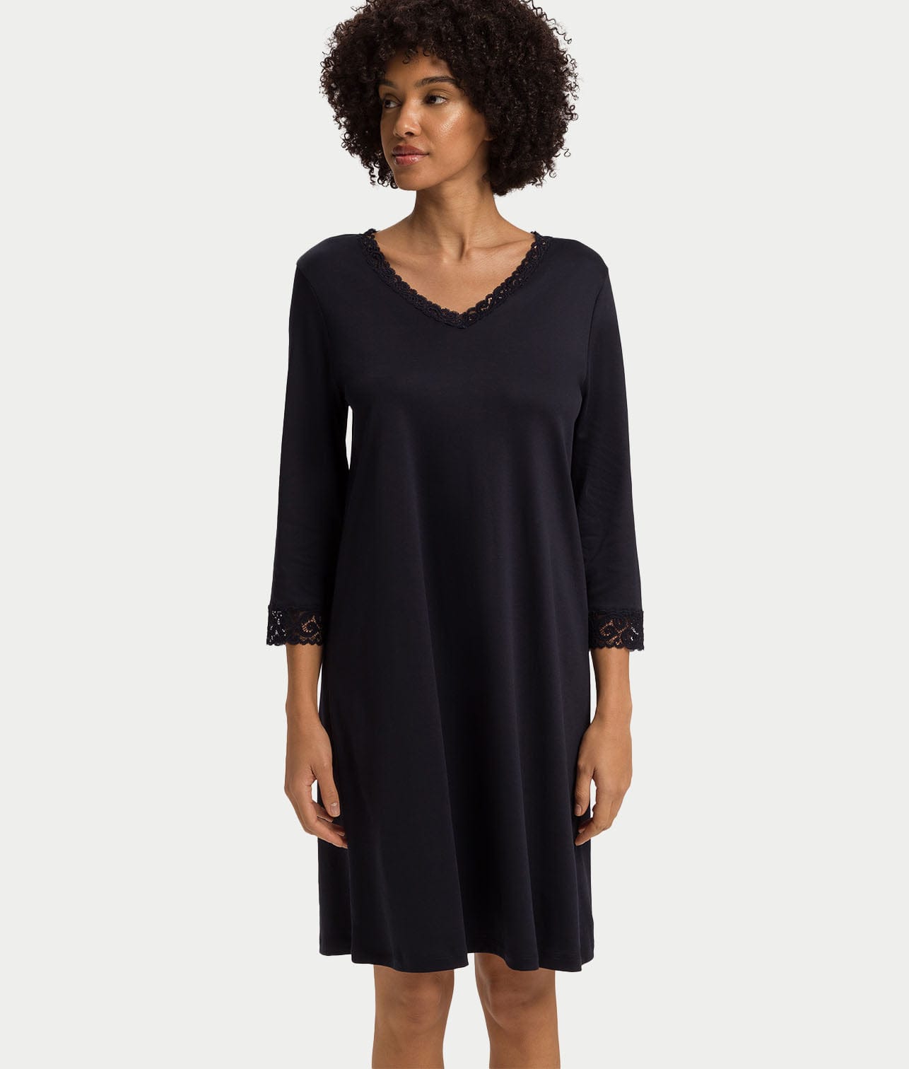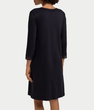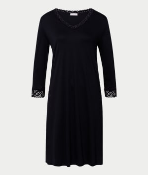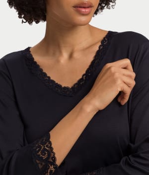 - Decadent lace on neckline and sleeves adds a feminine touch