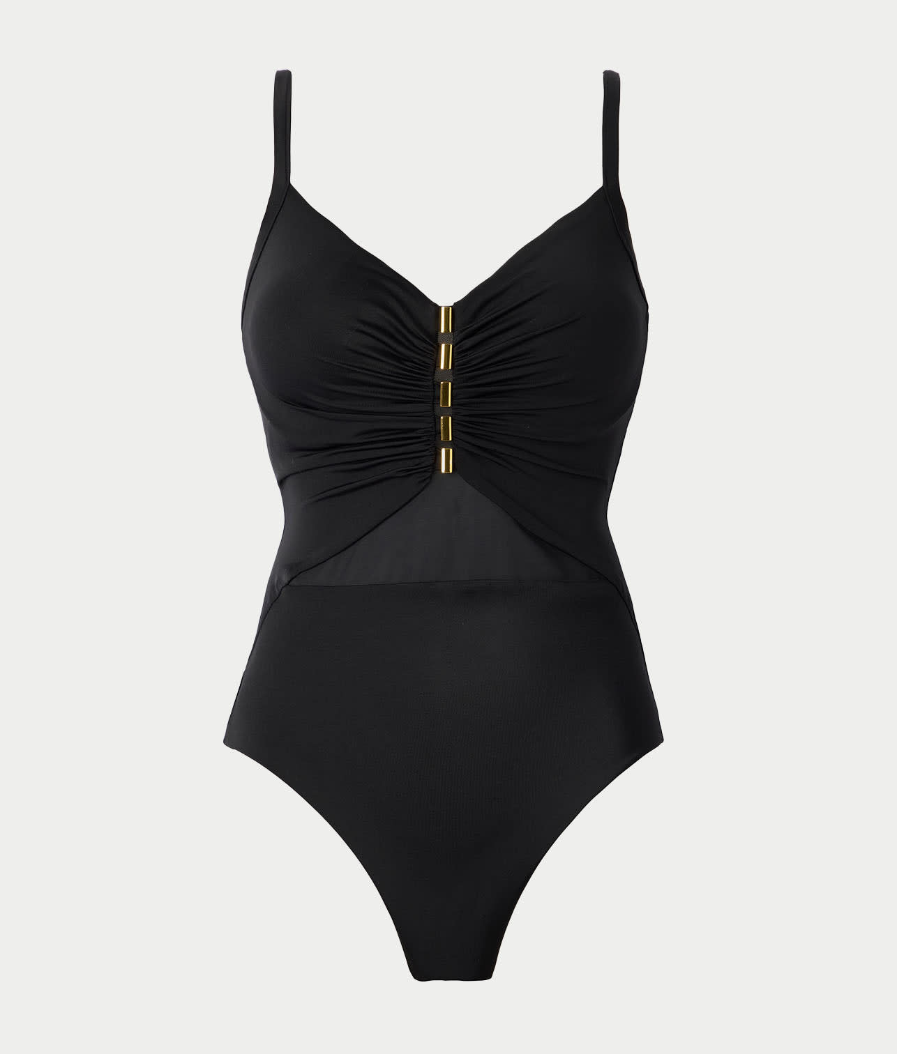 - Center front hardware detail with mesh inset at waist