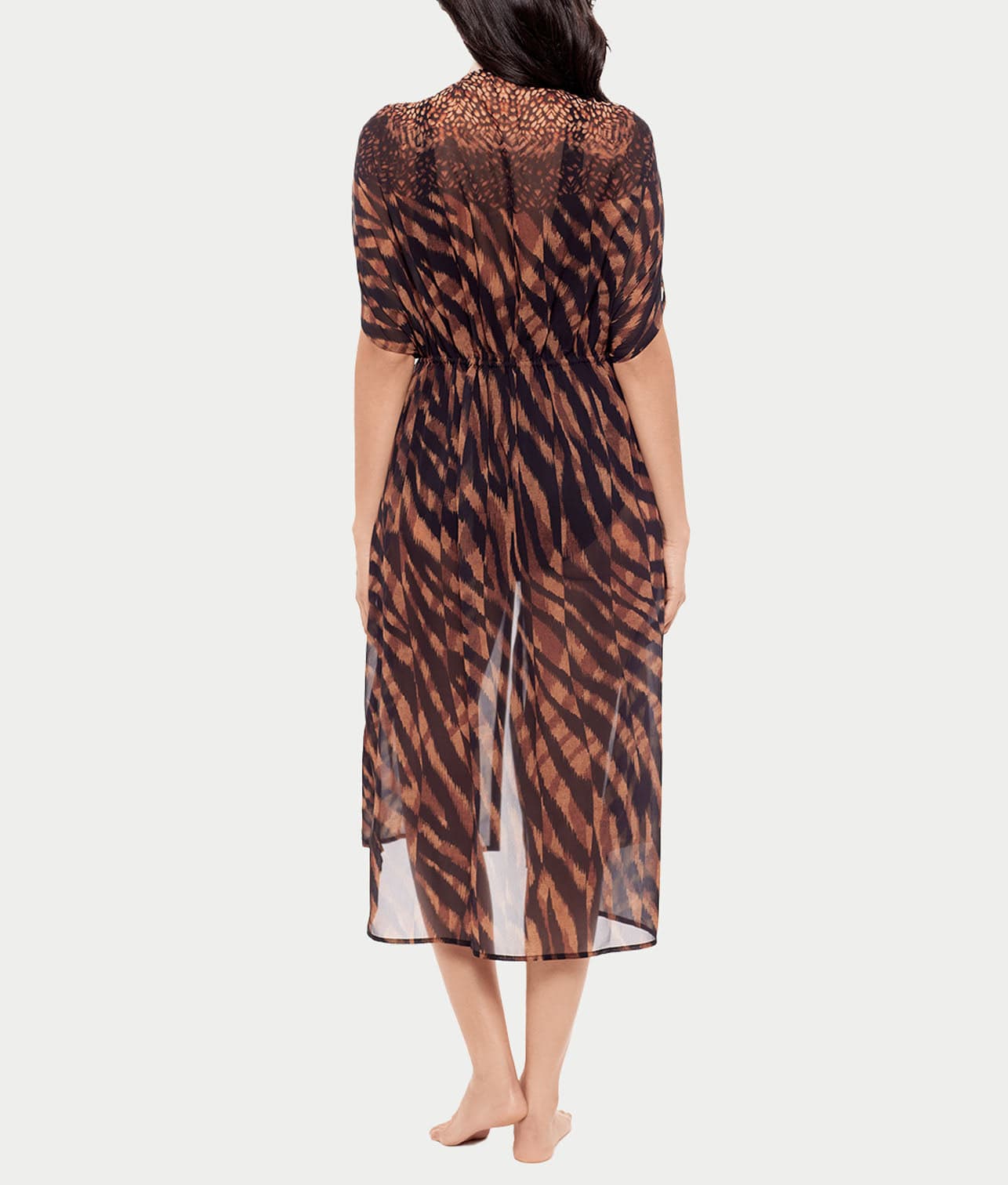 - Elongated cover-up with dynamic tribal stripes with tones of copper & chocolate