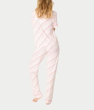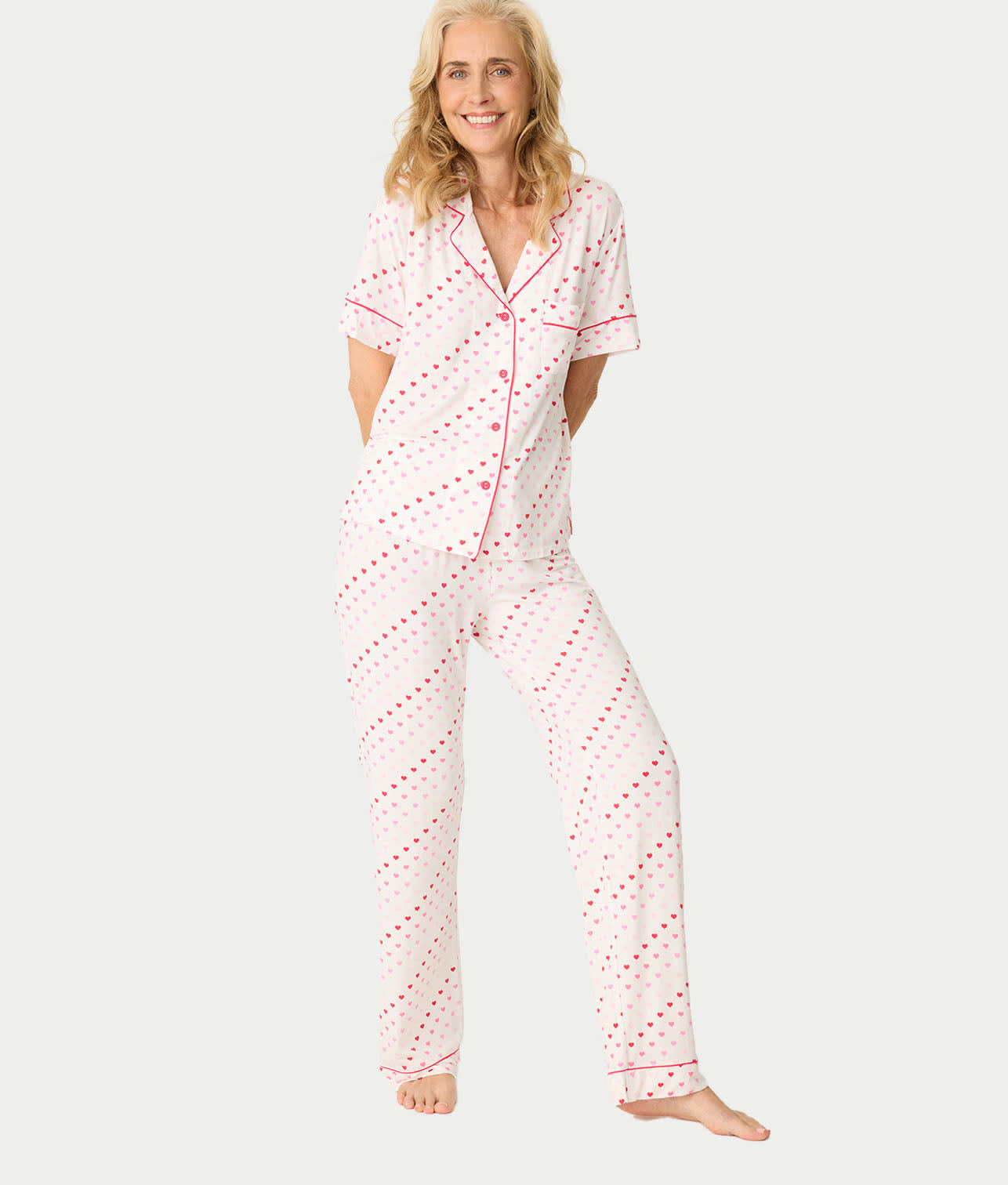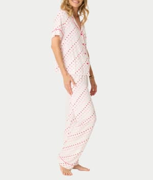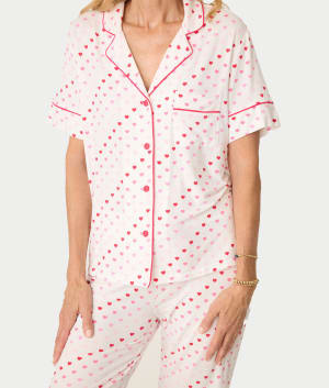 - Button-down v-neckline with contrasting red piping & short sleeves