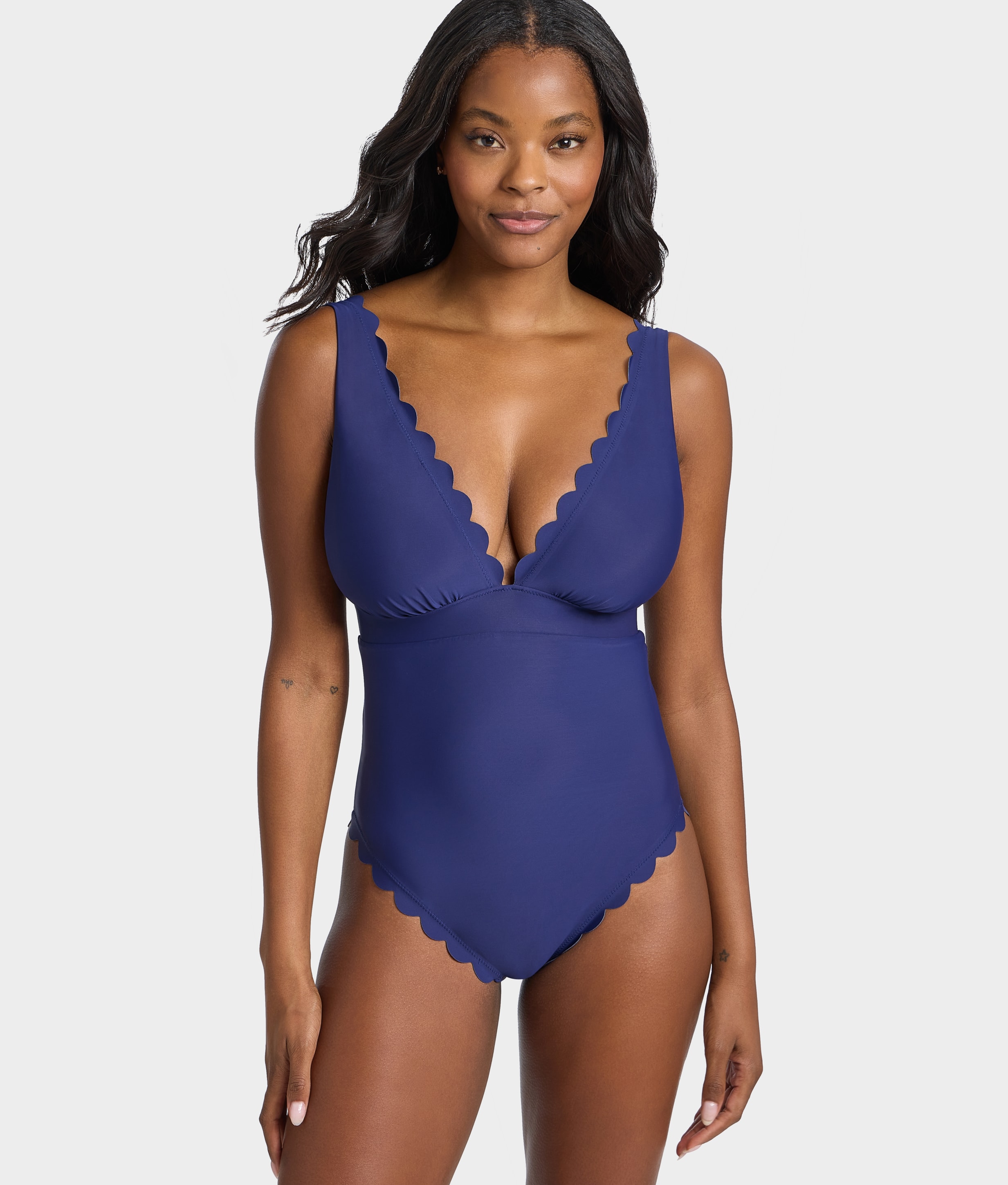 - Flattering one-piece swimsuit with a plunging front