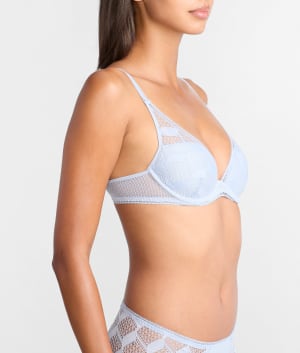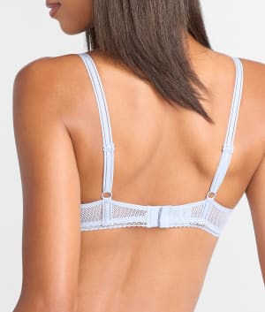 - Darted seamed cups are lined with foam with a delicate plunging neckline