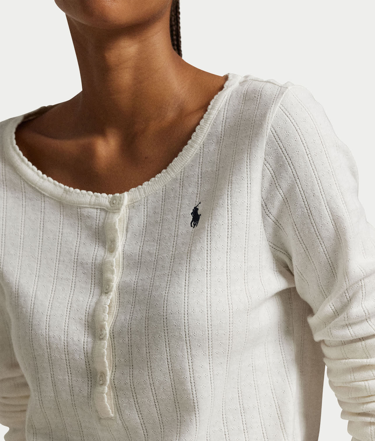 - Long sleeve top with classic henley button placket that offers adjustable coverage