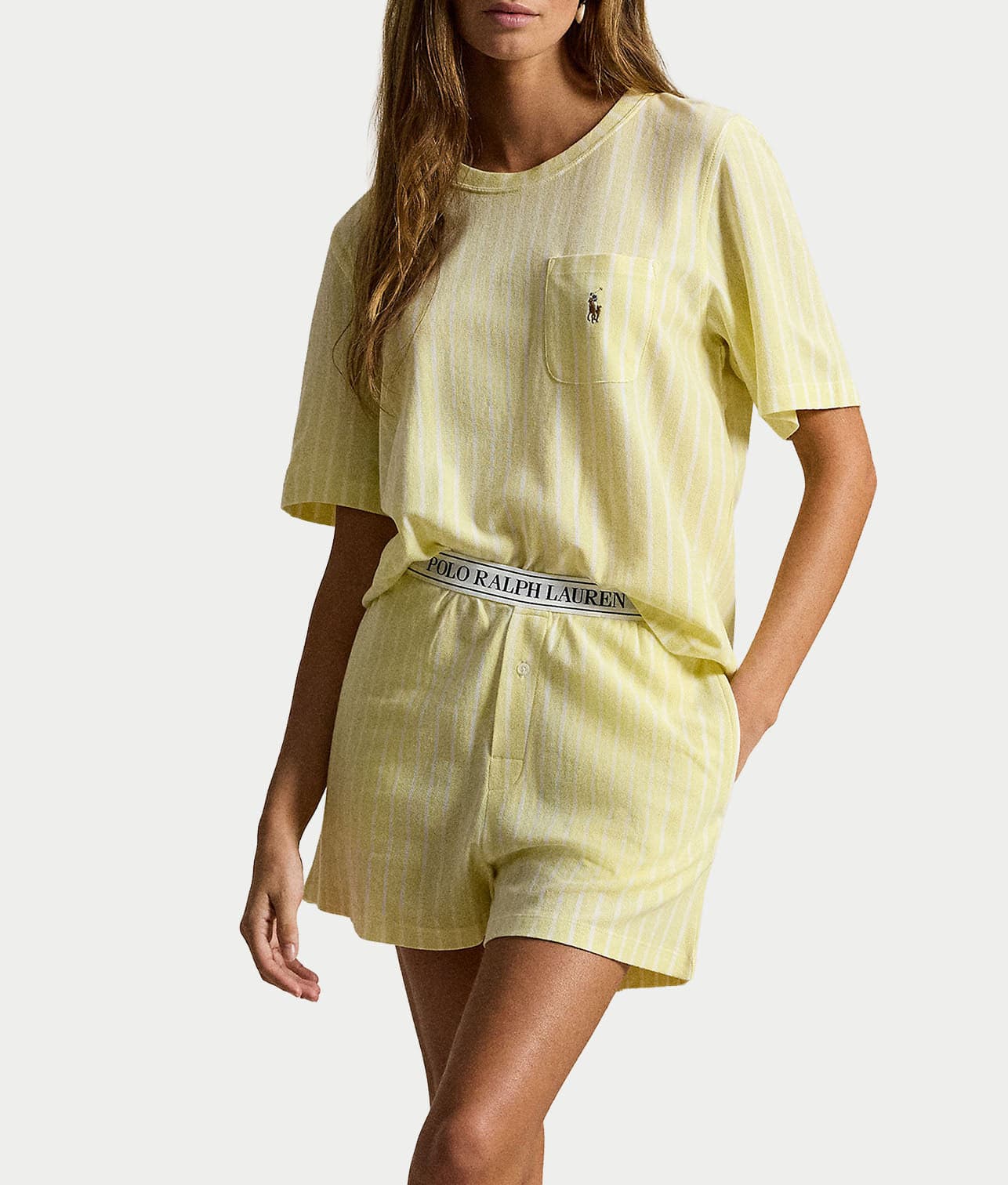 • Lounge for the day in this comfy pajama shorts set with stripes