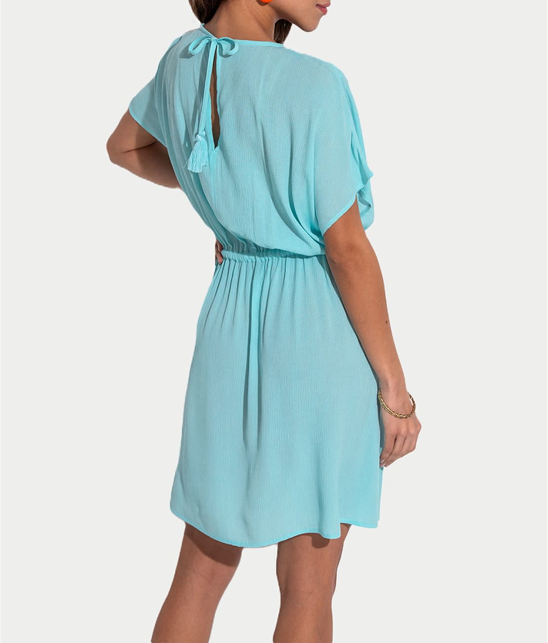 • Embroidered crochet V-neckline with flowy 3/4 length sleeves