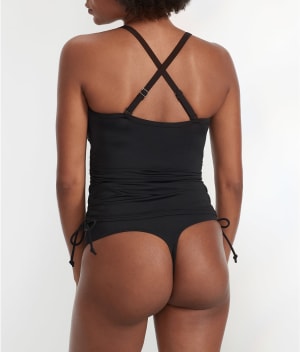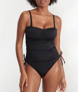 - Ruched sides with adjustable string ties