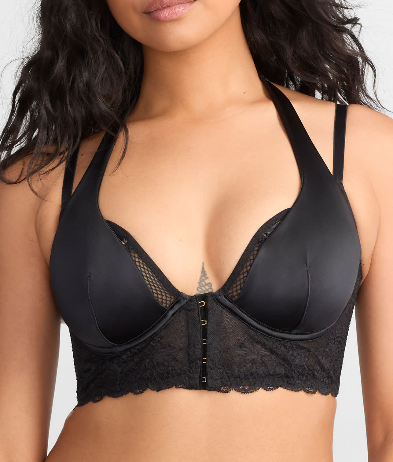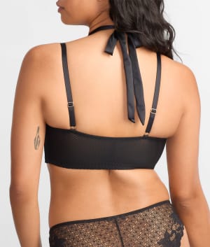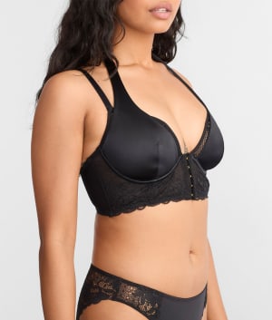- Overlay can be worn over cups or pushed down to show peek-a-boo detail