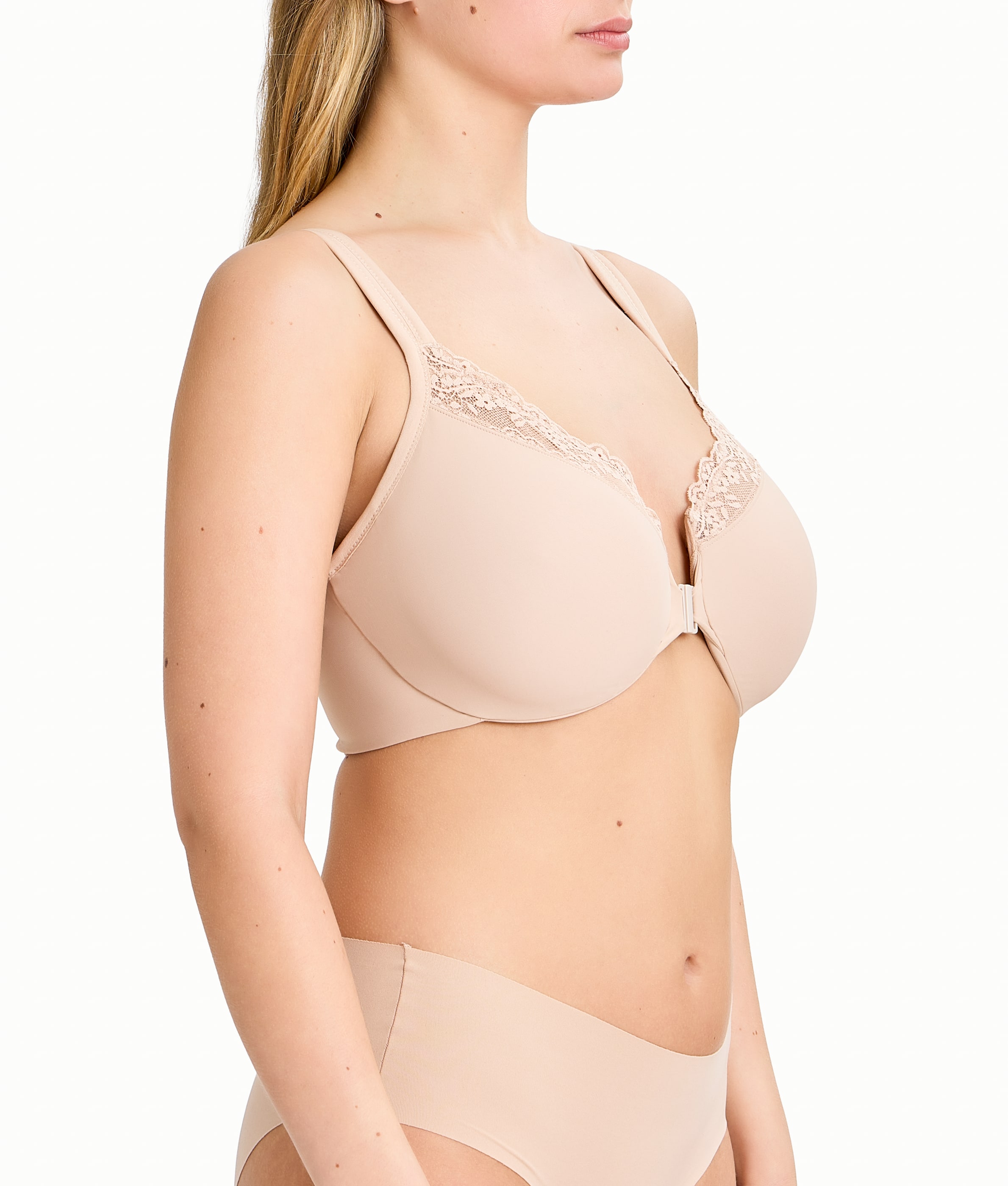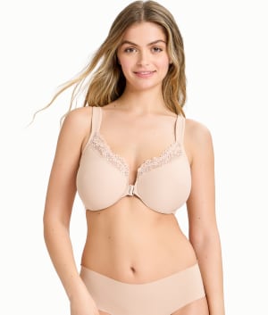 Seem up to an inch smaller in our minimizer that’s designed to be effortless in every way, from the front-closure and cushioned adjustable straps to the smooth, seamless stretch microfiber that does all the minimizing magic.