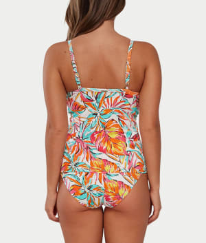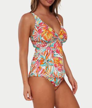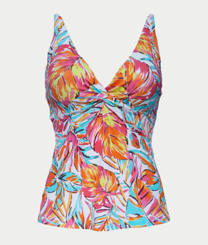 - Hit the beach in this twist-front, colorful printed tankini