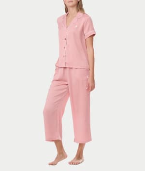 Notch Collar Cropped Woven Pajama Set Size