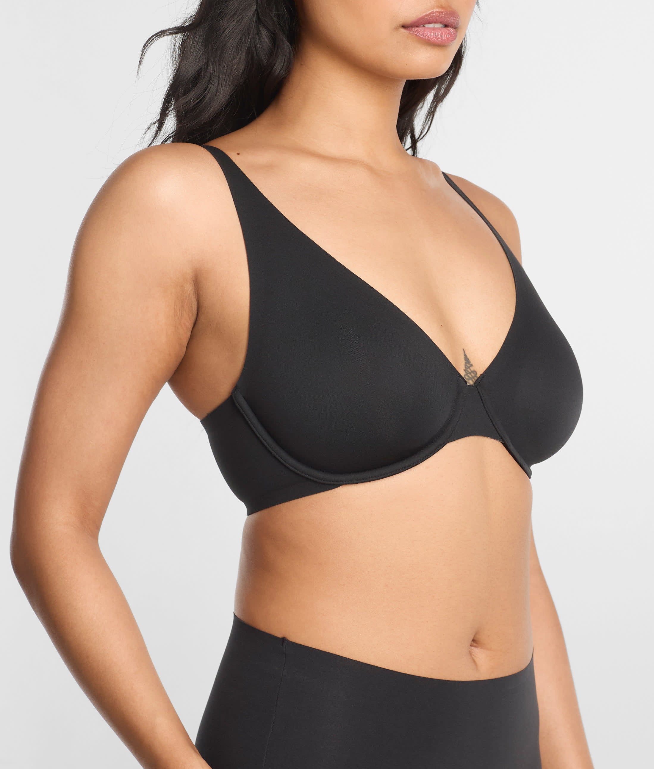 - Plunge neckline with bonded edge lies flat under clothes