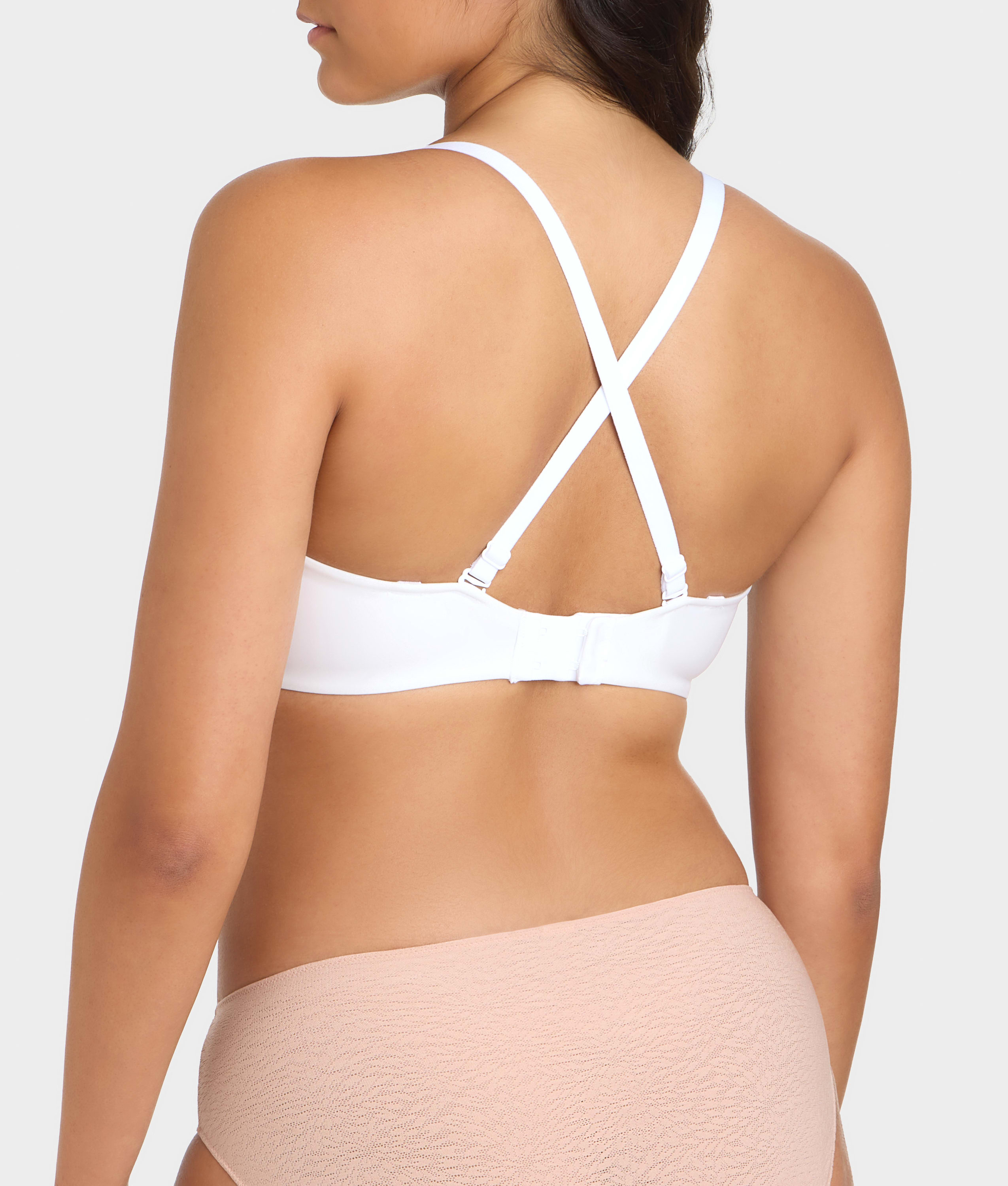 - Straps attach at two points on back band to create a narrower or wider fit